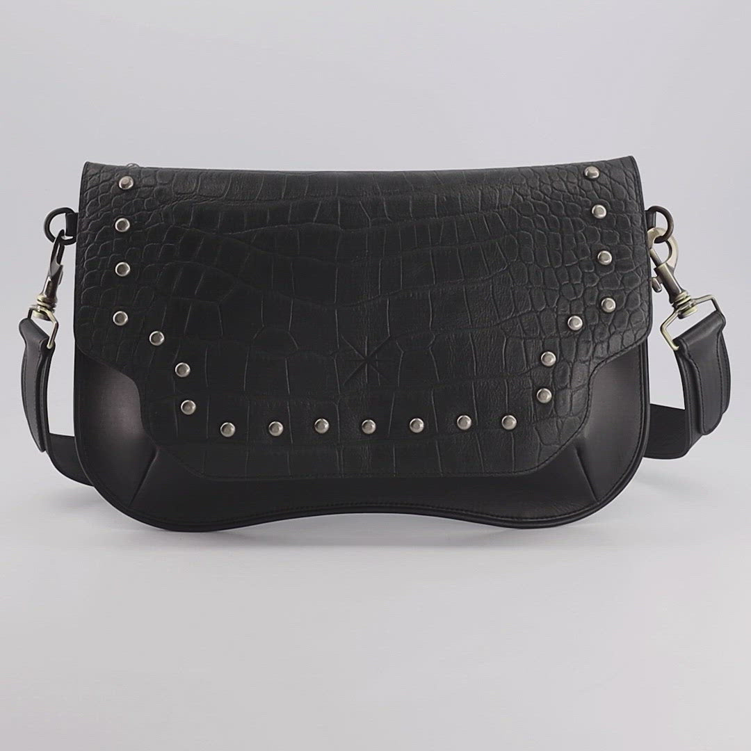 Le rabat KHARA en cuir Noir impression Croco pour base Star est la nouvelle capsule de cette saison. Un jeu de clous argentés sur son contour soulignent avec style les courbes du sac. Une allure décontractée, une pointe d'impertinence il a tout pour vous accompagner au fil des saisons.