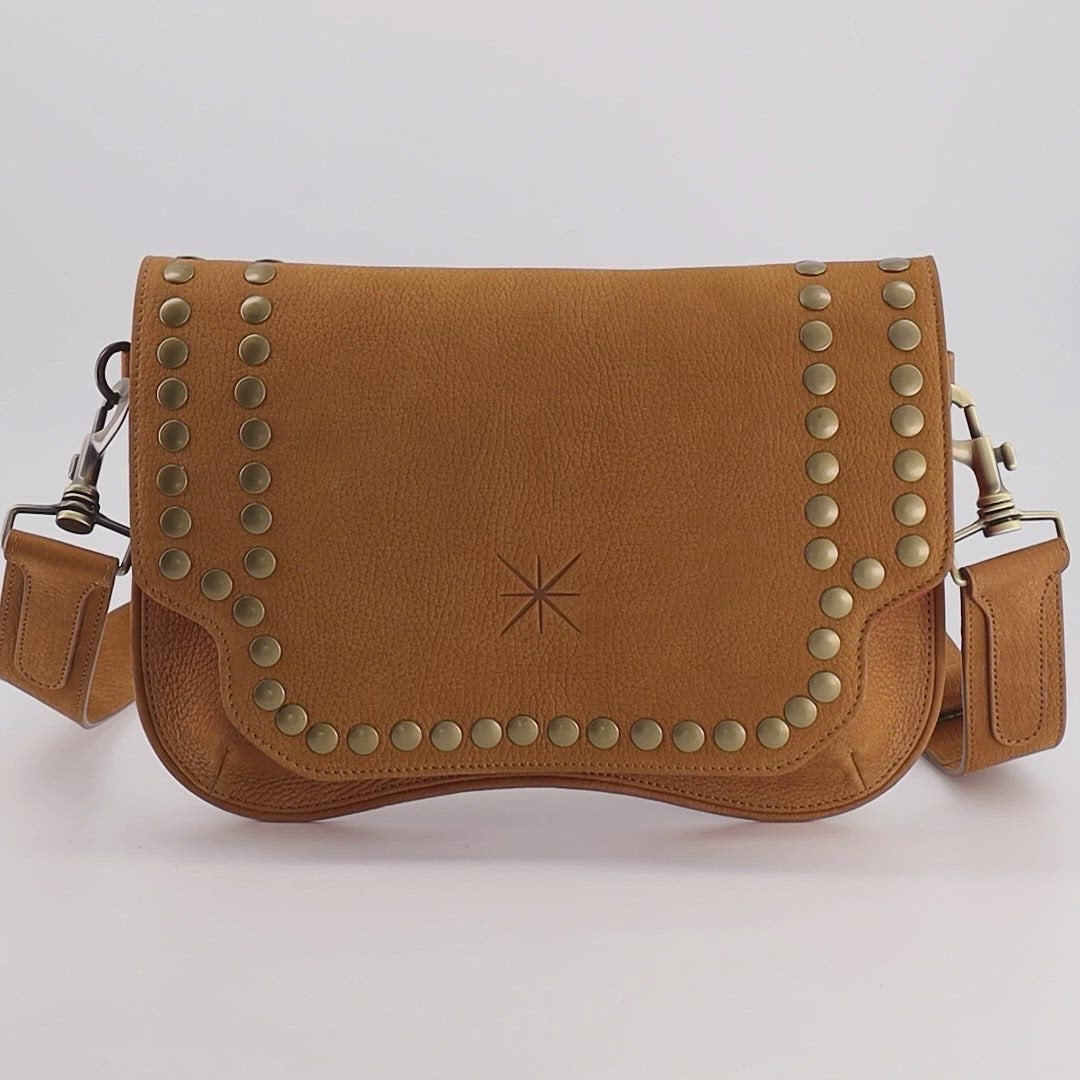 Le rabat Baby SIDIA en nubuck Camel au toucher velours est un best seller de la marque, le cloutage laiton "antic" sur son contour assure une allure casual et décontractée, il est le compagnon idéal de votre dressing.
