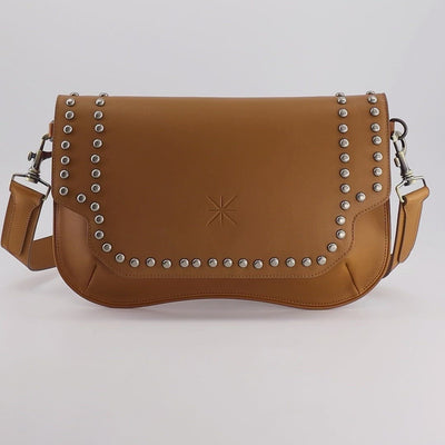 Le rabat STAR en cuir camel SIDIA apporte à votre tenue une patine authentique et chic. En cuir box clouté laiton "antic", sa découpe franche sur les bords en fait un partenaire parfait pour un style casual ou décontracté.