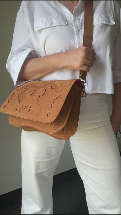 Un cuir nubuck velouté, un travail de découpe unique : le sac Rancho Camel conjugue artisanat et allure contemporaine.