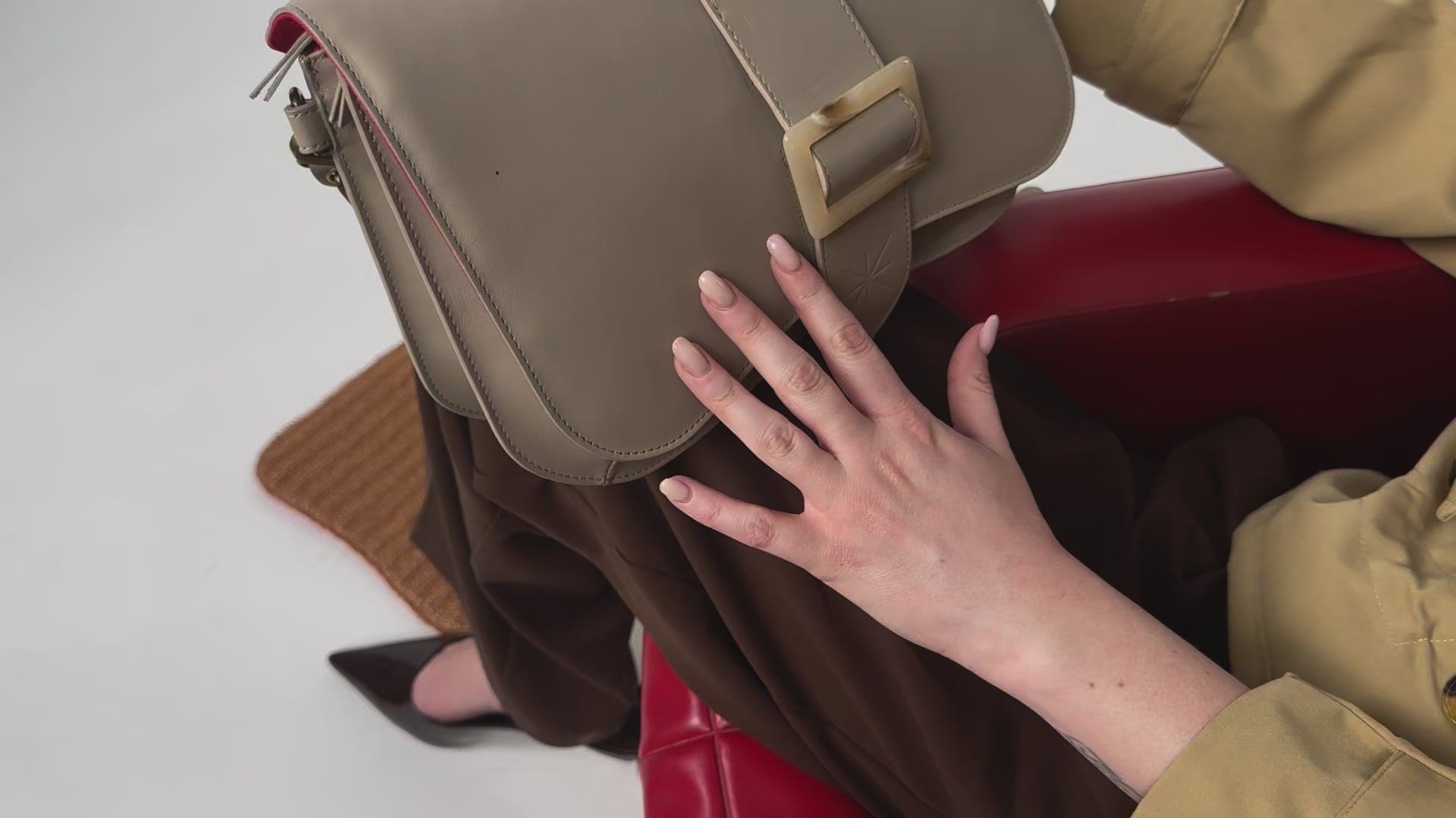 Le rabat Thara est orné d'une patte verticale ornée d'une boucle moirée dans un camaïeu de beige qui contraste délicatement avec la couleur du sac. L'ensemble s'inscrit dans un style citadin et élégant. Parfait pour accompagner vos journées.